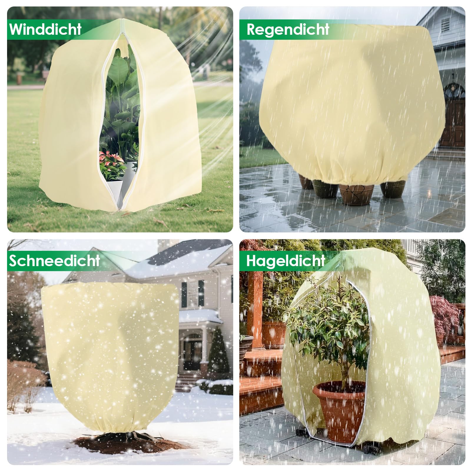 Deine Pflanzen überleben den Winter sicher mit dieser praktischen Schutzhaube! In riesigen 360x250cm Größe passt sie um die größten Kübelpflanzen. Ob empfindliche Olivenbäume, Zitronenbäume, Hortensien oder Palmen - die Haube schützt zuverlässig vor Frost, Schnee und eisigem Wind. Das 80g/m² Vlies ist atmungsaktiv, wasserabweissend und UV-beständig. Der große Reißverschluss und verstellbarer Kordelzug machen das Anbringen super einfach - in Sekunden ist die Pflanze eingepackt! Du kannst trotzdem easy gießen und nach deinen Pflanzen schauen. Das Material ist reißfest und hält mindestens zwei Winter durch, also richtig nachhaltig. Besonders praktisch für Balkonpflanzen oder im Garten. Einfach über die Pflanze stülpen, Reißverschluss zu, Kordelzug festziehen - fertig! Deine Pflanzen werden es dir im Frühjahr danken!