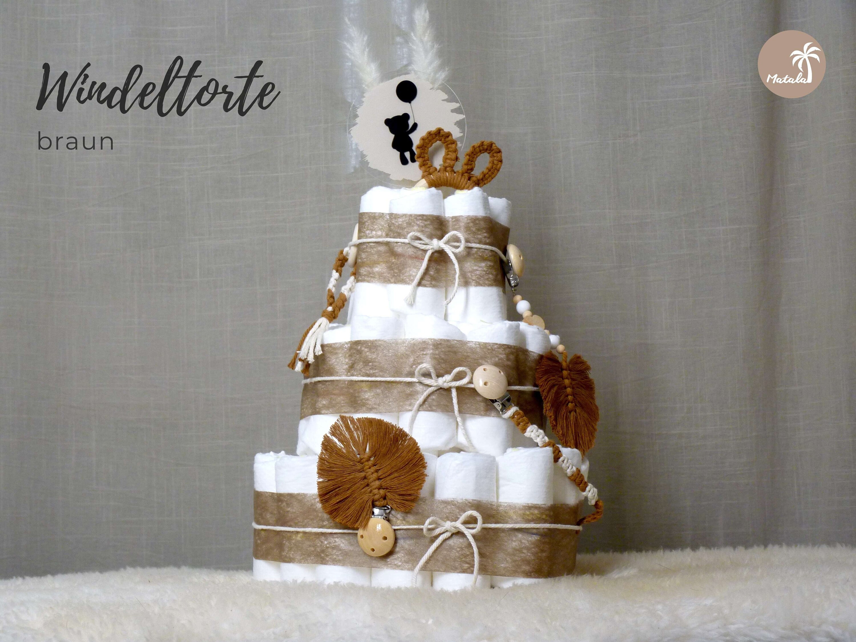 Praktisch: Die Torte lässt sich einfach öffnen und auseinandernehmen. Die Windeln werden nicht geklebt oder mit Nadeln befestigt, sodass wirklich alle Produkte verwendet werden können. Wichtig: Die Windeltorte ist kein Spielzeug und enthält Kleinteile, die für Kinder unter 3 Jahren nicht geeignet sind.