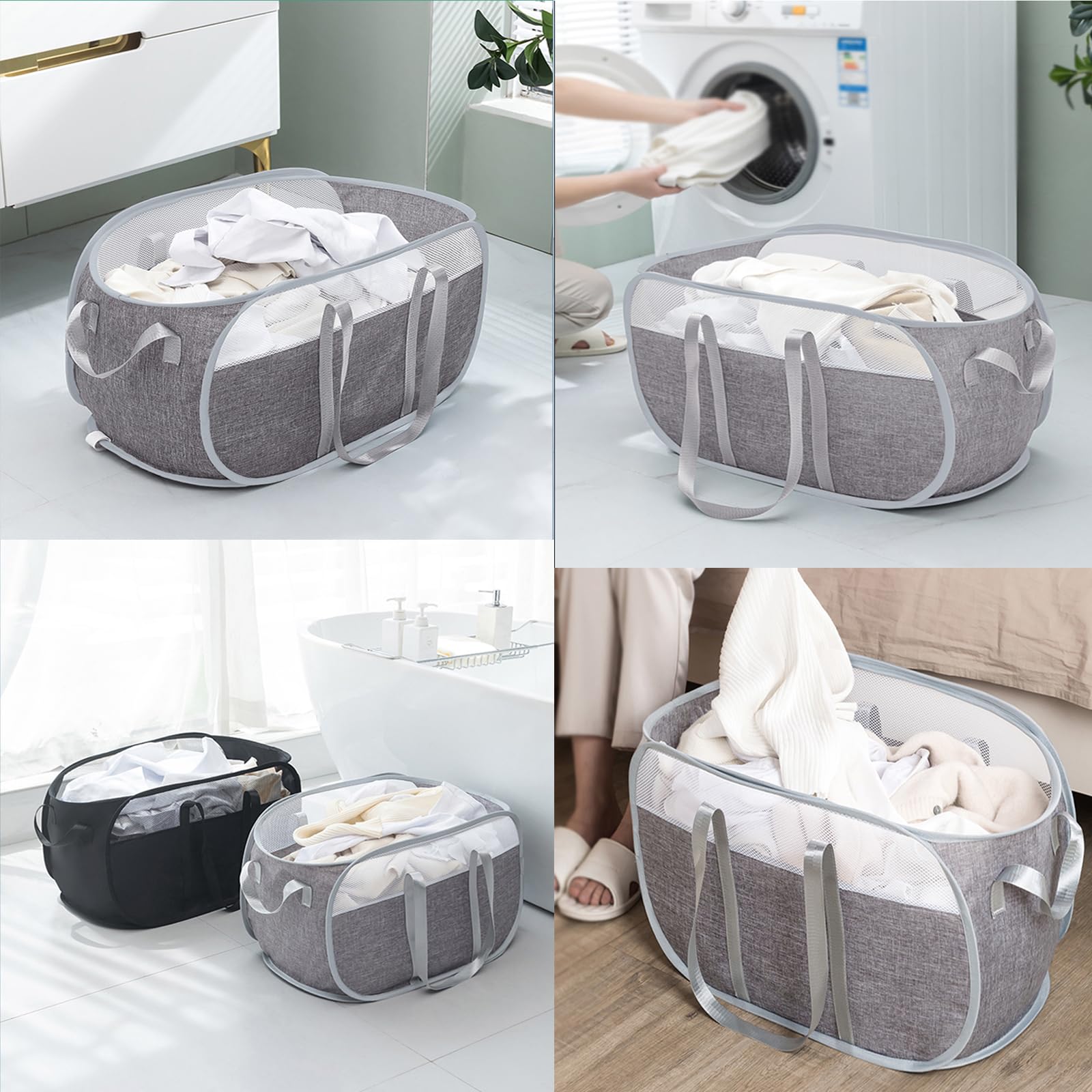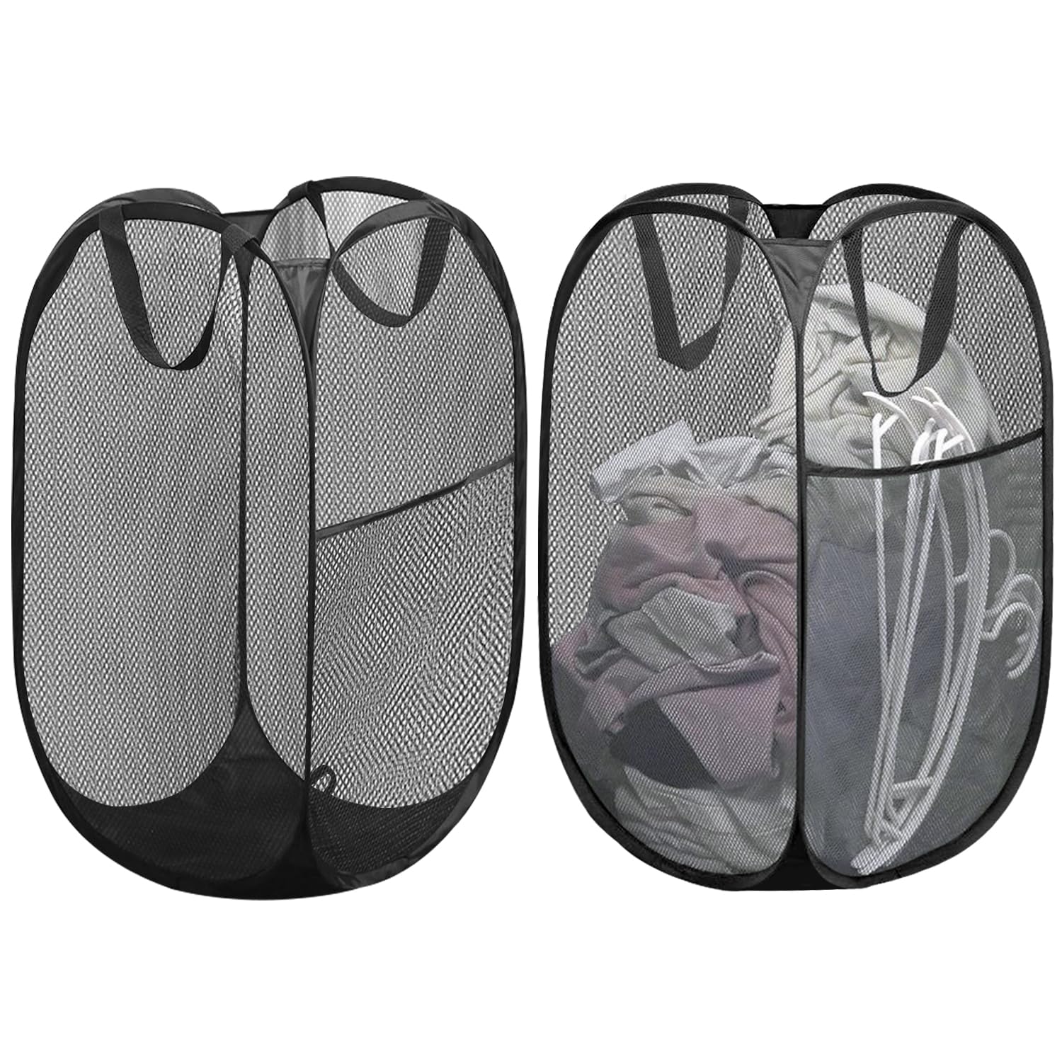 Platzsparende Wäschelösung! Diese 2 faltbaren Wäschekörbe sind super praktisch für zu Hause und unterwegs. Einfach aufklappen - schon stehen sie stabil mit 58cm Höhe und 36cm Breite. Das Mesh-Material ist atmungsaktiv, schimmelfest und hält deine Wäsche frisch. Nach Gebrauch klappst du sie einfach zusammen und verstaut sie platzsparend. Perfekt fürs Kinderzimmer, Camping oder Reisen. Mit praktischem Tragegriff - einfach zu transportieren. Aus robustem Netzgewebe mit Stahldraht-Rahmen. Nicht nur für Wäsche, sondern auch ideal für Spielzeug, Decken oder als Aufbewahrungskorb. Im praktischen 2er-Set!