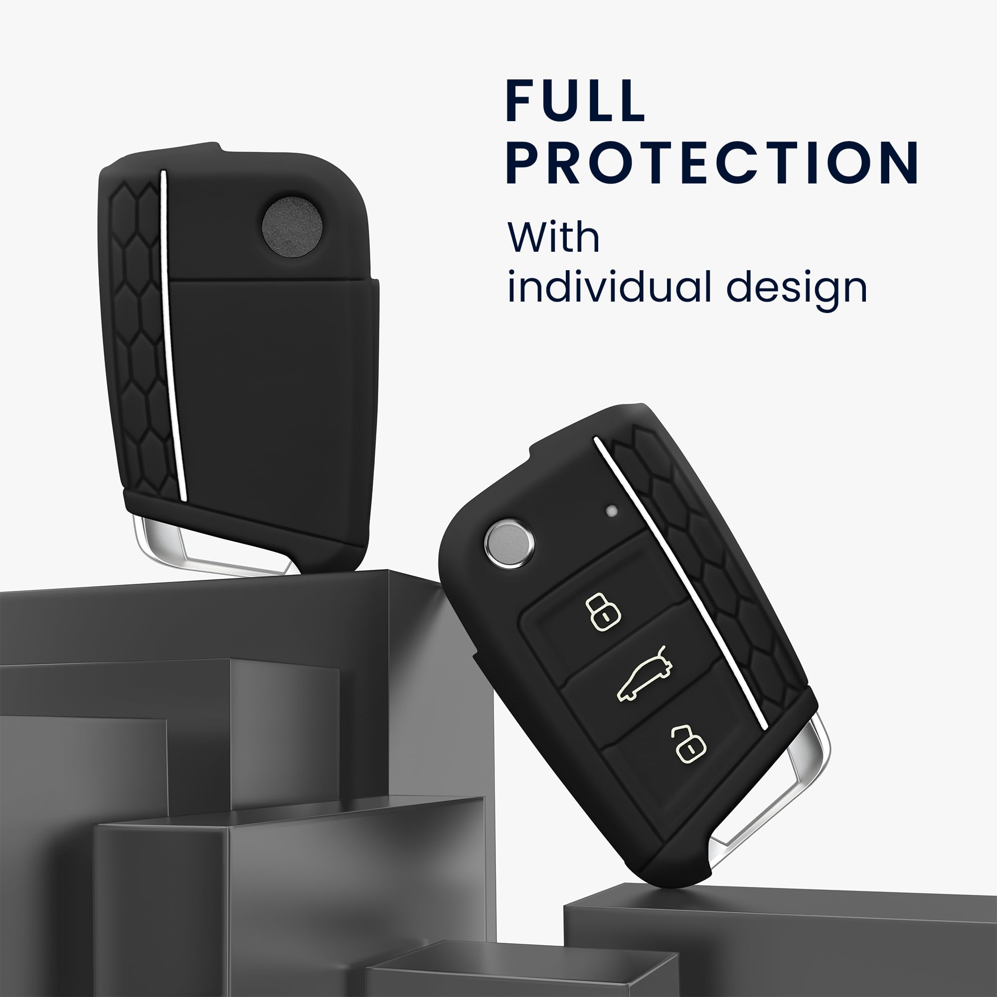Schlüssel verlieren? Kratzer am teuren Autoschlüssel? Dieses schicke Silikon-Cover von kwmobile löst alle Probleme! Speziell für Mitsubishi 3-Tasten Schlüssel entwickelt - kompatibel mit Outlander, Lancer, Pajero Sport, ASX, RVR und L200. Aus flexiblem TPU-Silikon gefertigt, das sich perfekt an den Schlüssel anpasst und dabei reißfest und rutschfest ist. Die mattschwarze Oberfläche sieht nicht nur edel aus, sondern verhindert auch lästige Fingerabdrücke. Alle Tasten lassen sich problemlos bedienen und sind klar auf der Hülle aufgedruckt. Die strukturierte Oberfläche gibt zusätzlichen Grip - kein Verrutschen mehr in der Hand! Einfach über den originalen Schlüssel ziehen und schon ist er vor Kratzern, Stößen und alltäglichem Verschleiß geschützt. Perfekt für alle, die ihren Autoschlüssel lange schön erhalten wollen. Das coole Design verleiht dem Schlüssel einen modernen Look und macht ihn gleichzeitig unverwechselbar. Einfach aufziehen und los geht's - Schutz und Style in einem!