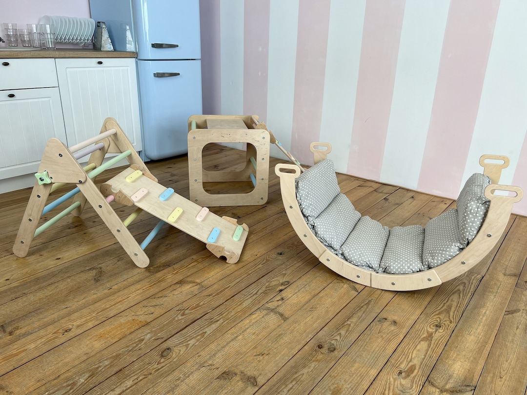 Dieses 9-in-1 Montessori Spielset ist der absolute Traum für kleine Entdecker! Im coolen Dino-Design mit Rutsch, Wippe, Schaukel, Kletterdreieck, Bogen, Rampe, Spieltunnel und Sortierspiel - da wird es nie langweilig. Aus robustem Massivholz gefertigt, super stabil und sicher. Maße: Bogenleiter 76,9x44,7x37cm, Dreieckleiter 56x55cm, Rutsche 92,5x39,6x14cm. Inklusive Sitzkissen und zwei Dino-Autos für noch mehr Spielspaß. Fördert spielerisch Motorik, Gleichgewicht und Koordination - genau das Richtige für die Entwicklung von 1-3 jährigen Kindern. Die weichen Polster schützen vor Stößen, die Anti-Rutsch-Pads geben zusätzlichen Halt. Einfach aufzubauen mit der beiliegenden Anleitung. Perfekt für Regentage oder wenn mal nicht rausgegangen werden kann - so haben Kinder ihren eigenen Indoor-Spielplatz!