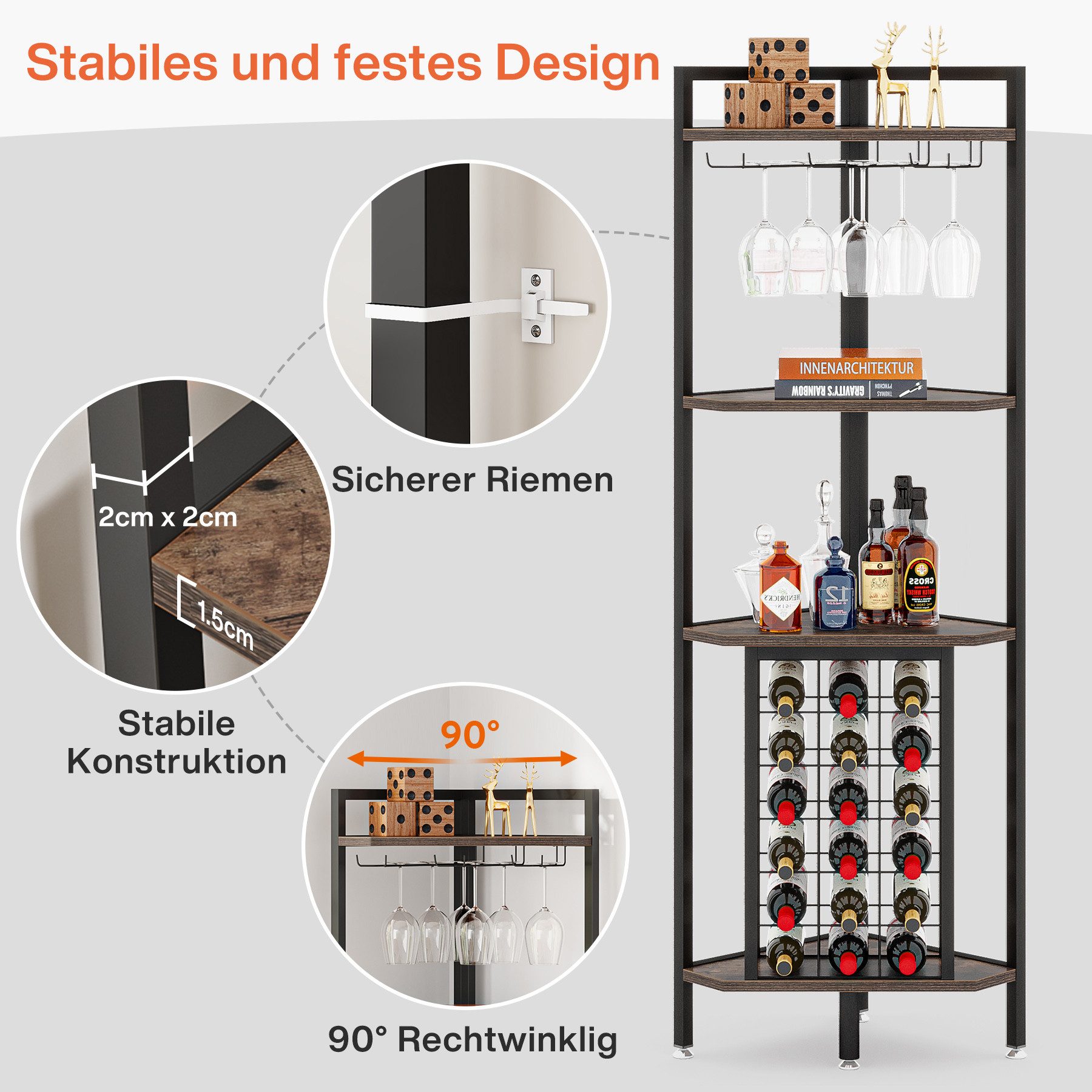 Platzsparend und stylisch! Dieses 5-stöckige Eck-Weinregal in Vintage-Braun mit schwarzem Metallrahmen ist perfekt für Weinkenner. Mit 42x42x172cm bietet es Platz für bis zu 12 Weinflaschen (bis 9,4cm Durchmesser) und hat zusätzlich 6-8 Glashalter. Die offenen Fächer eignen sich auch für Weinkühler, Bücher oder Deko. Verstellbare Füße sorgen für Stabilität auf unebenen Böden, Anti-Kipp-Beschläge garantieren Sicherheit. Ideal für Wohnzimmer, Küche, Bar oder Restaurant - mach deine Weinsammlung zum Hingucker!