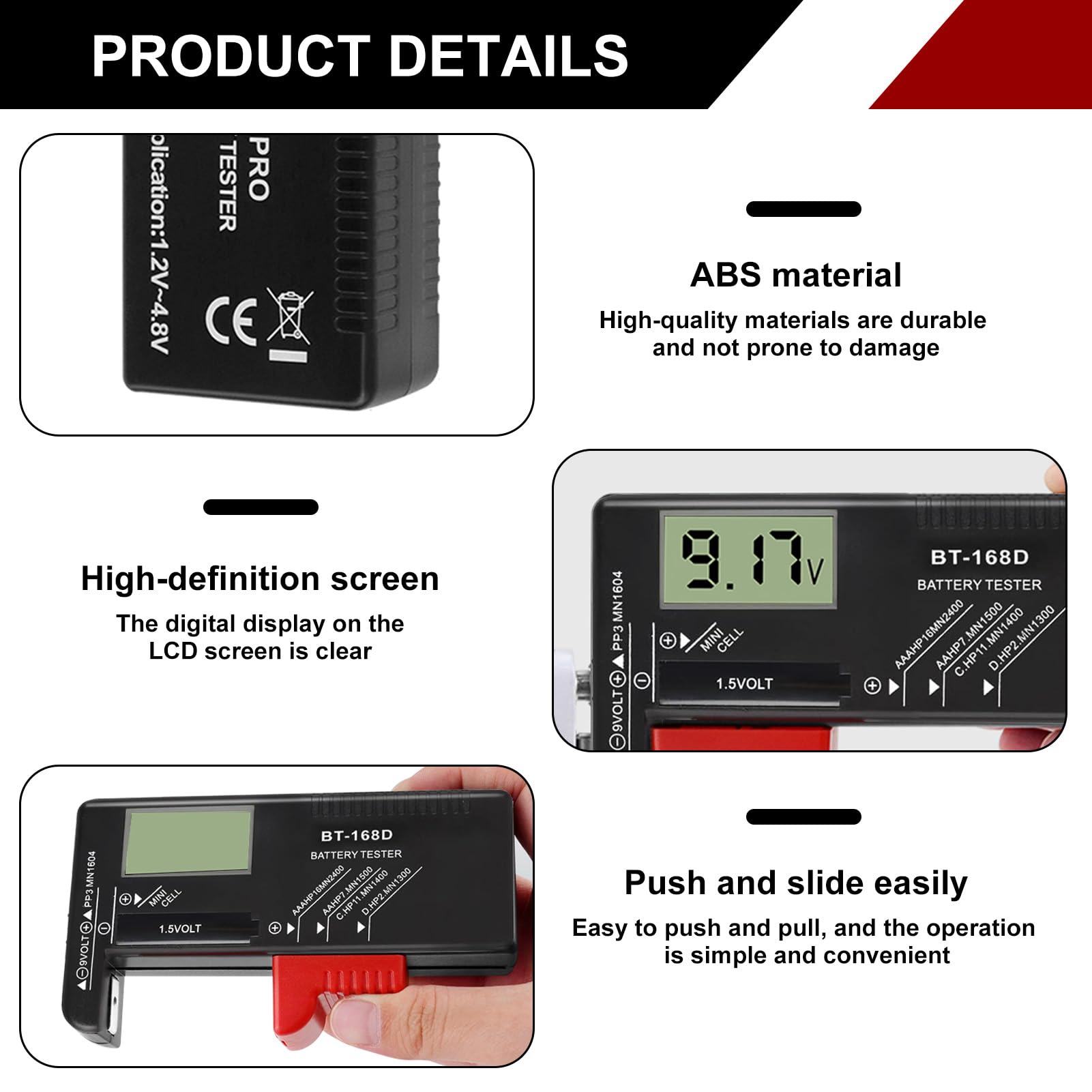 Nie wieder raten, ob eine Batterie noch gut ist! Dieser digitale LCD-Batterietester zeigt dir genau, wie viel Saft noch in deinen Batterien steckt. Kompatibel mit allen gängigen Typen: AA, AAA, C, D, 9V-Batterien und sogar Knopfzellen. Das klare LCD-Display zeigt den Ladezustand in klaren Ziffern an - so siehst du sofort, ob die Batterie voll, schwach oder leer ist. Das Beste: Der Tester benötigt keine eigene Stromversorgung - er wird allein durch die zu testende Batterie betrieben. Super praktisch für Zuhause, Werkstatt oder unterwegs. Perfekt für Fernbedienungen, Spielzeug, Taschenlampen, Rauchmelder, Uhren und vieles mehr. Kompakt und leicht - passt in jede Schublade oder Werkzeugkiste. Hergestellt aus robusten Materialien für lange Haltbarkeit. Spare Geld und schone die Umwelt, indem du nur wirklich leere Batterien ersetzt. Ein unverzichtbares Tool für jeden Haushalt - damit dir nie wieder mitten im Spiel oder beim wichtigen Gerät der Saft ausgeht!