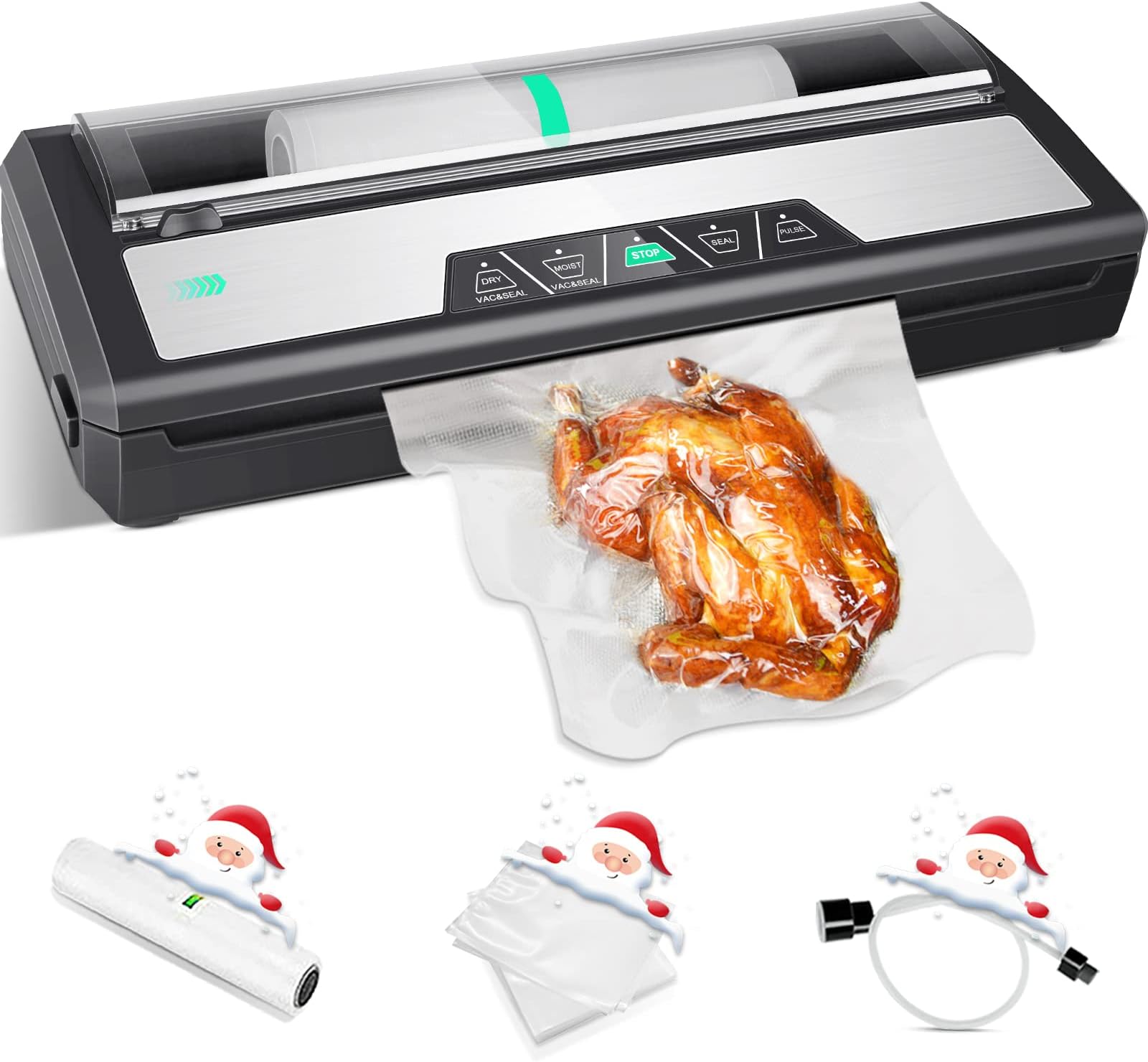 Schluss mit schlecht gewordenen Lebensmitteln! Dieses Bonsenkitchen Vakuumiergerät ist dein neuer bester Freund in der Küche. Mit dem starken 135-W-Motor und 4 Vakuumpumpen saugt es bis zu 50 Beutel in nur 20 Minuten luftdicht ab - effizienter geht's kaum! Perfekt für Meal Prep, Sous Vide oder einfach zur längeren Aufbewahrung von Lebensmitteln. Das durchdachte Design macht alles super einfach: Integrierter Beutelcutter, Aufbewahrungsfach für Rollen und ein praktischer Beutelhalter verhindert Falten. Der Easy-Lock-Griff ermöglicht Einhandbedienung - mega praktisch! Mit nur 68 dB ist das Gerät angenehm leise. Fünf verschiedene Modi stehen zur Auswahl: Vac & Seal, Pulse Vac, Seal, Extended Seal und Accessory Mode - für trockene und feuchte Lebensmittel optimal! Die verbreiterte 3,3-mm-Heizleiste sorgt für starke, luftdichte Versiegelungen. So bleiben deine Lebensmittel bis zu 8x länger frisch - weniger Abfall, mehr Platz im Kühlschrank! Im Lieferumfang: 1 Rollenbeutel (28x600 cm), 10 vorgeschnittene Beutel (20x30 cm) und externes Vakuumzubehör. Restaurant-Frische für zu Hause - jetzt wird's professionell in deiner Küche!
