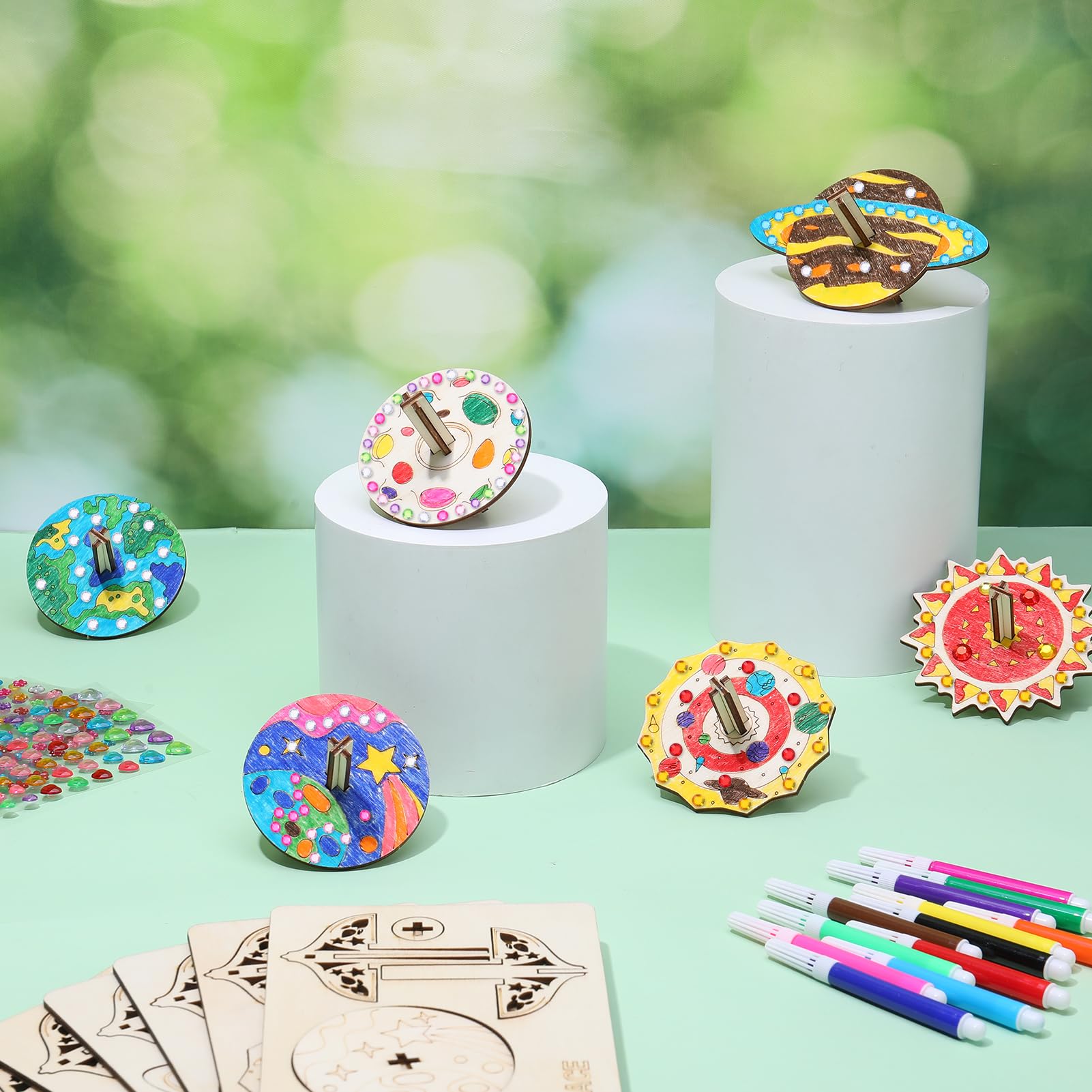 Holzkreisel Bausatz 12-teilig – Bastelset Für Kinder Mit Stiften & Stickern