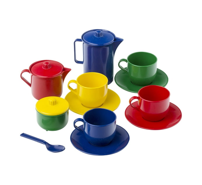 Mama, Papa - Tee trinken! Dieses süße GOWI Teeset bringt Café-Feeling ins Kinderzimmer! 8 bunte Teile: Kanne mit Deckel, 2 Tassen, 2 Unterteller und 2 Löffel. Perfekt für kleine Gastgeber ab 12 Monaten. Aus hochwertigem, ungiftigem Kunststoff - total robust und langlebig. Leicht zu reinigen - einfach abwaschen und weiter geht's mit dem Spiel! Die verschiedenen Farben machen richtig Laune. Fördert die Kreativität und soziales Spielen - so lernen Kids ganz nebenbei. Passt super zu jeder Kinderküche. Maße 16x11x19 cm - genau richtig für kleine Hände. Seit 1825 steht GOWI für Qualität - das merkt man! Einfach das eigene Café eröffnen und Gäste bewirten. Auch super als Geschenk zum Geburtstag oder einfach so. Die Kleinen sind stundenlang beschäftigt - und du hast mal ne Minute für dich! Einfach bestellen und strahlende Kinderaugen garantieren!