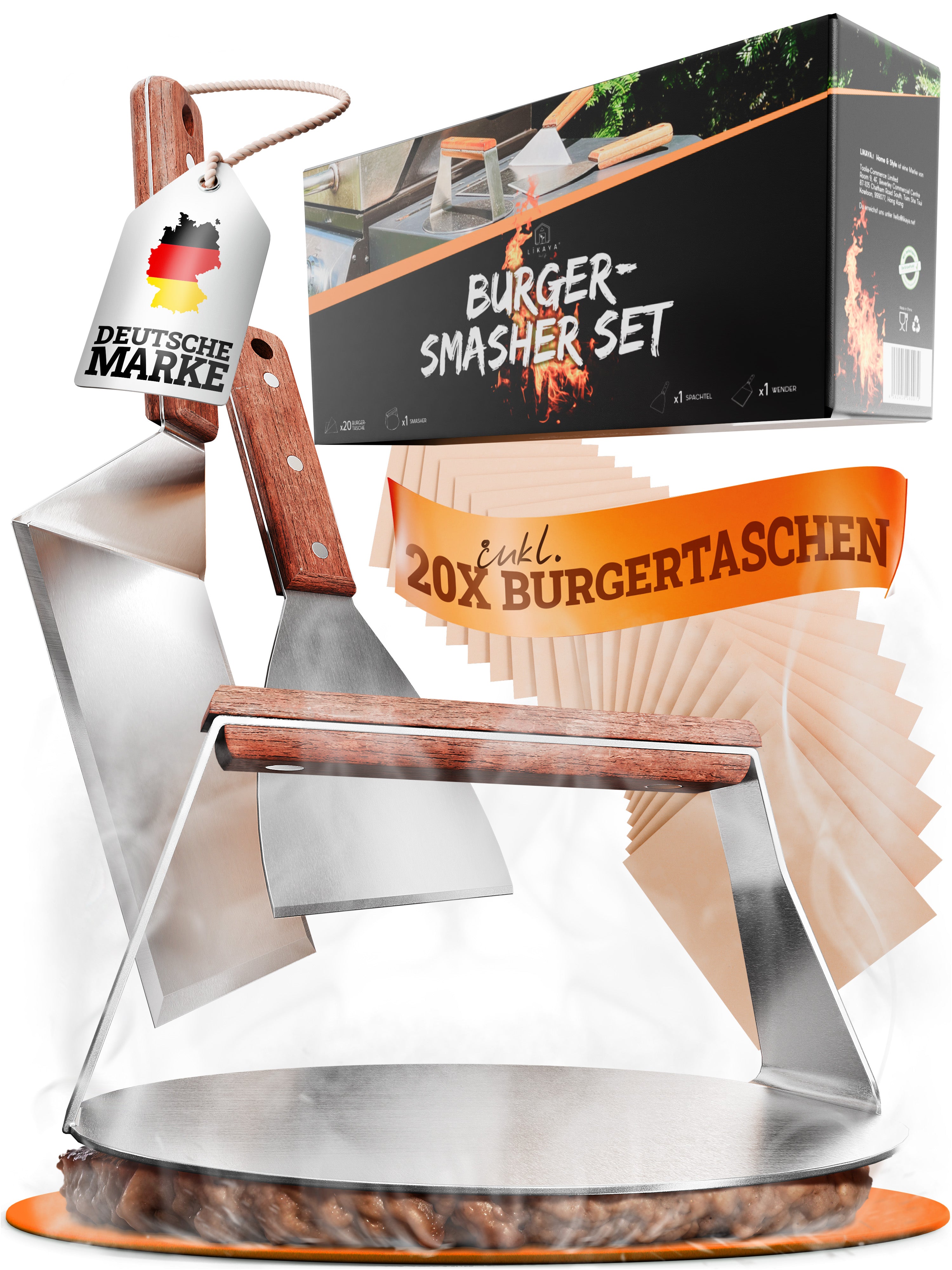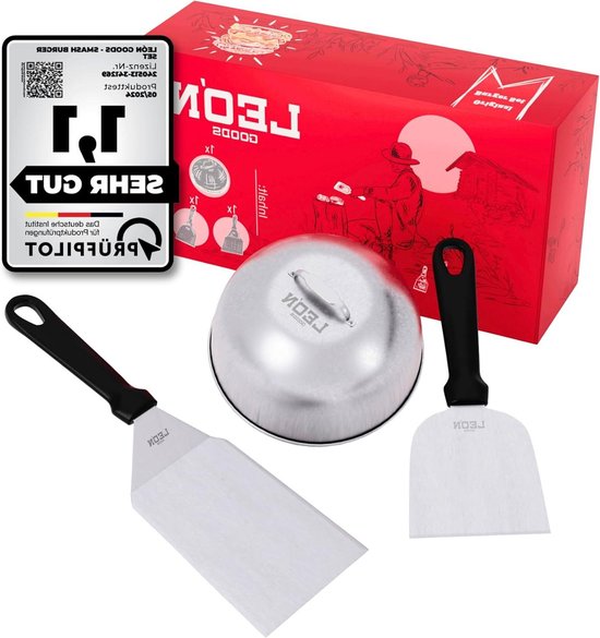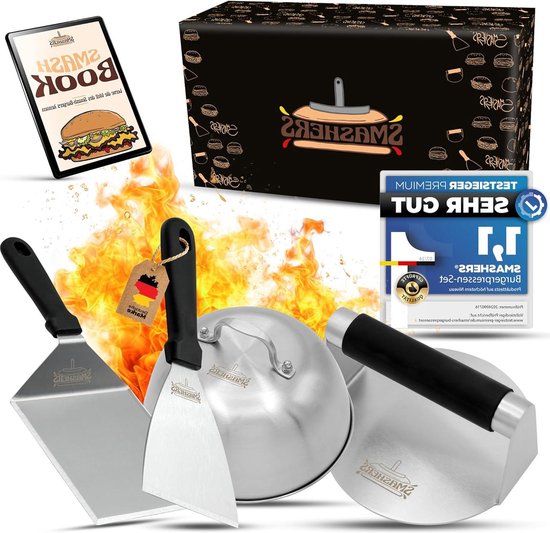 Burger-Fans aufgepasst! Dieses Kinfezlon Smash Burger Set macht dich zum Grill-Profi. Komplett 5-teilig: Smash Burger Presse (14 cm), zwei Grillspatel aus Edelstahl, Gewürzflasche und Silikonbürste. Alles aus hochwertigem Edelstahl 304 und Massivholz - lebensmittelecht, rostfrei und spülmaschinengeeignet. Die Presse sorgt für perfekt flache, knusprige Burger-Patties. Die dünnen Grillspatel wenden Fleisch und Gemüse mühelos. Super praktisch für Gasgrill, Plancha, Teppanyaki oder Induktion. Die Holzgriffe sind hitzebeständig und liegen gut in der Hand. Perfekt für Gartenpartys, Grillabende oder Camping. Kompakt verstaubar, nimmt kaum Platz weg. Ob für klassische Burger, Steaks oder Gemüse - dieses Set meistert alles. Einfach reinigen und lange Freude haben. Das ideale Geschenk für alle Grill-Begeisterten!
