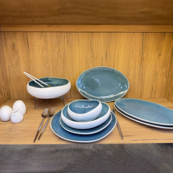 Atemberaubendes Geschirrset für deinen Tisch! 55 Teile für bis zu 12 Personen - inklusive flache Teller, Pastateller, Dessertteller, Suppenschalen, Servierplatten und mehr. Aus robustem Steinzeug mit galaktisch inspiriertem Reactive Glaze-Finish in tiefem Blau und Weiß. Jedes Stück ein Unikat! Spülmaschinen- und gefriersicher - super praktisch im Alltag. Perfekt für Familienessen, Feiern oder Dinnerpartys. Sieht einfach luxuriös aus und ist dabei extrem funktional. Verwandelt jede Mahlzeit in ein besonderes Erlebnis!