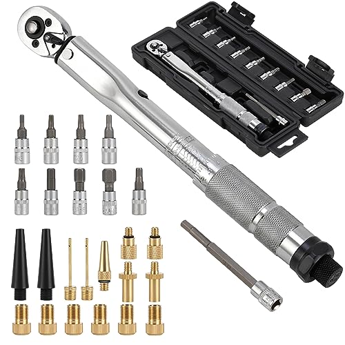 Perfektes Werkzeug-Set für alle Fahrrad- und Motorrad-Fans! Dieses 15-teilige Drehmomentschlüssel-Set hat alles, was du für präzise Reparaturen brauchst. Mit einem Drehmomentbereich von 2-24 Nm und 1/4 Zoll Antrieb passt es ideal für sensible Bauteile am Bike. Enthalten sind 8 Innensechskant-Bits (2-10mm), 2 Blumenkopf-Bits (T25, T30), 2 Kreuzschlitz-Bits (PH1, PH2) und ein Ein-Wort-Kopf (4mm). Der Ratschenkopf lässt sich in beide Richtungen verwenden - super praktisch bei beengten Verhältnissen! Mit 200mm Länge liegt er gut in der Hand und die klare Skala ermöglicht exakte Einstellungen. So vermeidest du Überdrehungen und schützt empfindliche Komponenten. Alles sicher verstaut in einer praktischen Kunststoff-Box - ideal für Werkstatt oder unterwegs. Ob Bremsen einstellen, Lenker montieren oder Schrauben nachziehen - mit diesem Set machst du alles professionell!