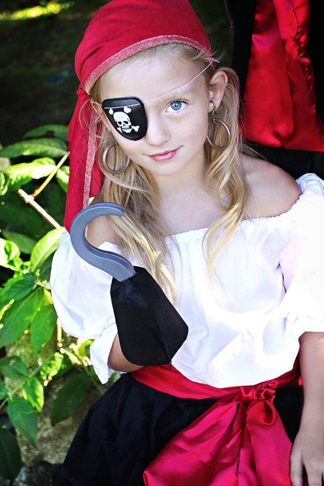 Enthalten sind: Piratenrock, Gürtel, Bandana, Augenklappe, Kompass, Geldbörse mit Münzen, Messer, Schatzkarte, Ohrringe, Haken und kleine Anhänger. Alles in rot-schwarzem Design mit coolen Totenkopf-Motiven.