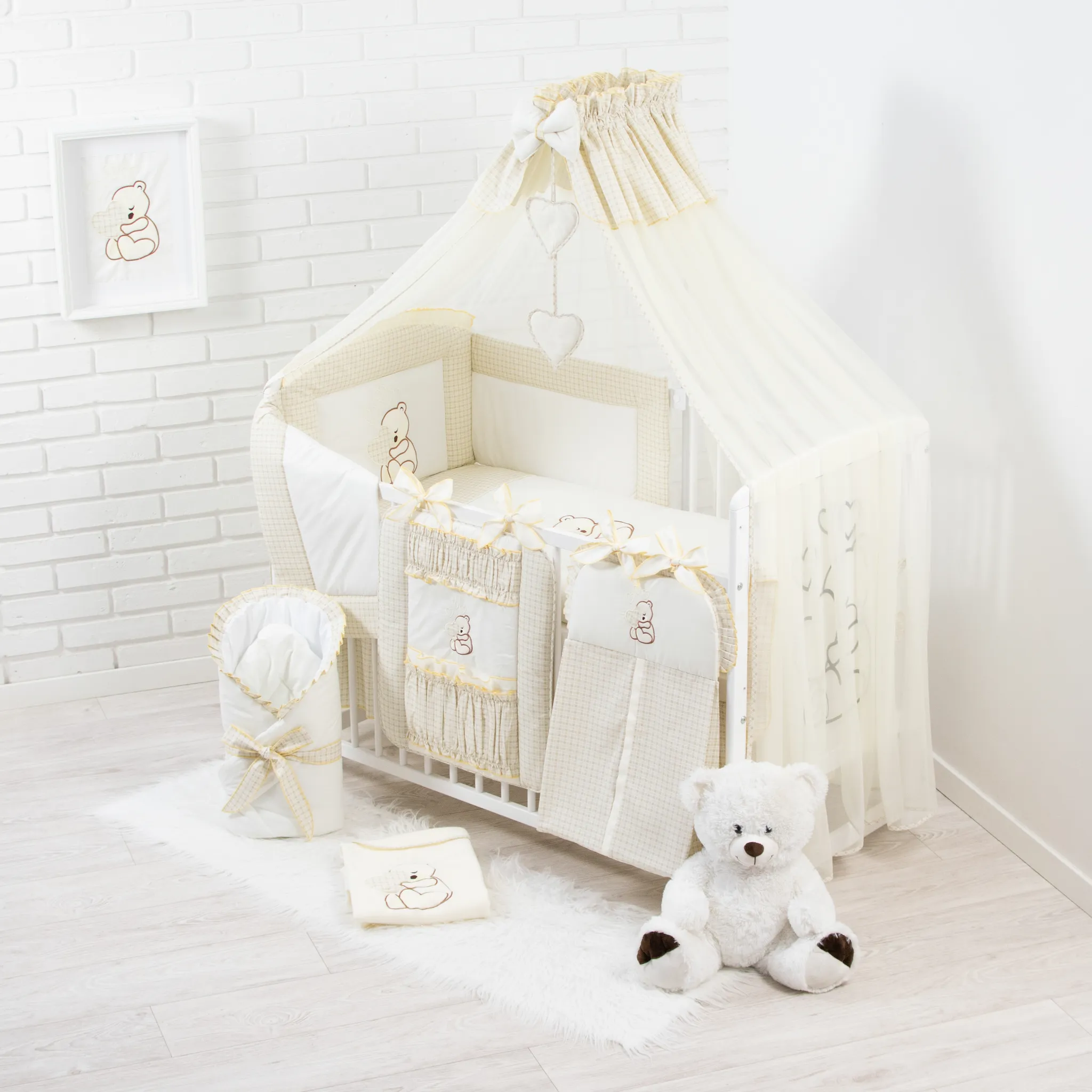 Wow, was für ein süßes Babybett-Set! Das Bello24 Happy Leo Komplett-Set hat wirklich alles, was du für deinen kleinen Schatz brauchst. Mit 13 Teilen bist du perfekt ausgestattet - inklusive Massivholz-Bettchen, Matratze, kuscheliger Bettwäsche und sogar einem romantischen Betthimmel. Das Bett ist in 3 Höhen verstellbar, wächst also super mit deinem Baby mit. Alles aus hochwertigen Materialien Made in EU, besonders hautfreundlich für zarte Babyhaut. Der Betthimmel aus zartem Chiffon schützt vor Zugluft und Insekten. Perfekt für Neugeborene und Kleinkinder - hier schläft es sich garantiert gut! Das Design mit Teddybär, Mond und goldenen Sternchen ist einfach nur niedlich.