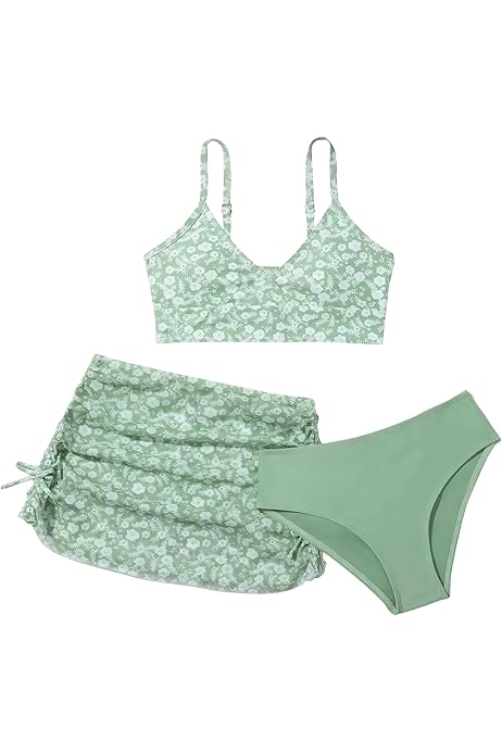 Mädchen Bikini Set 3-teilig - Mit Top, Hose & Rock - Blumenmuster, Verstellbar - Für Teenager