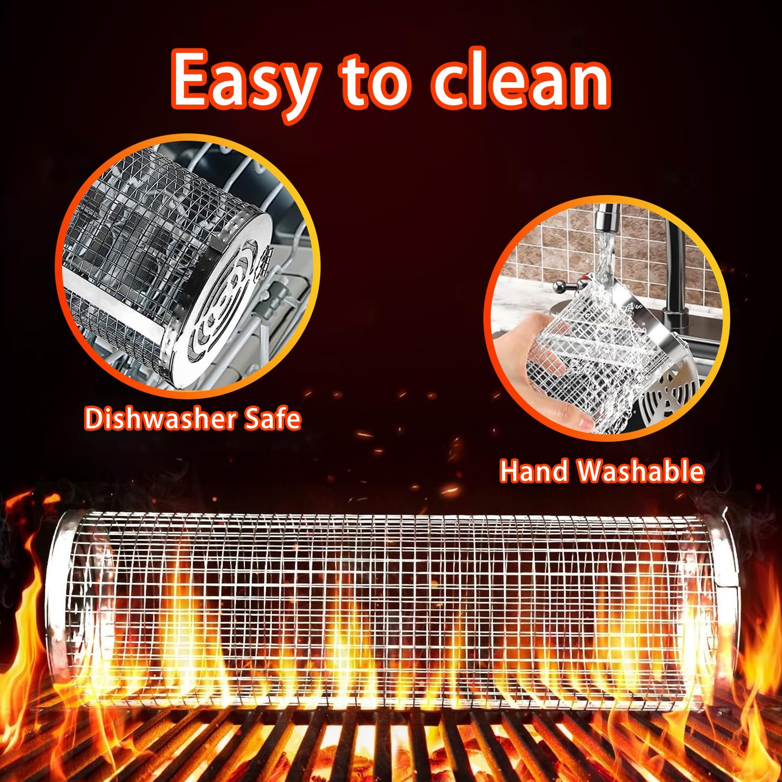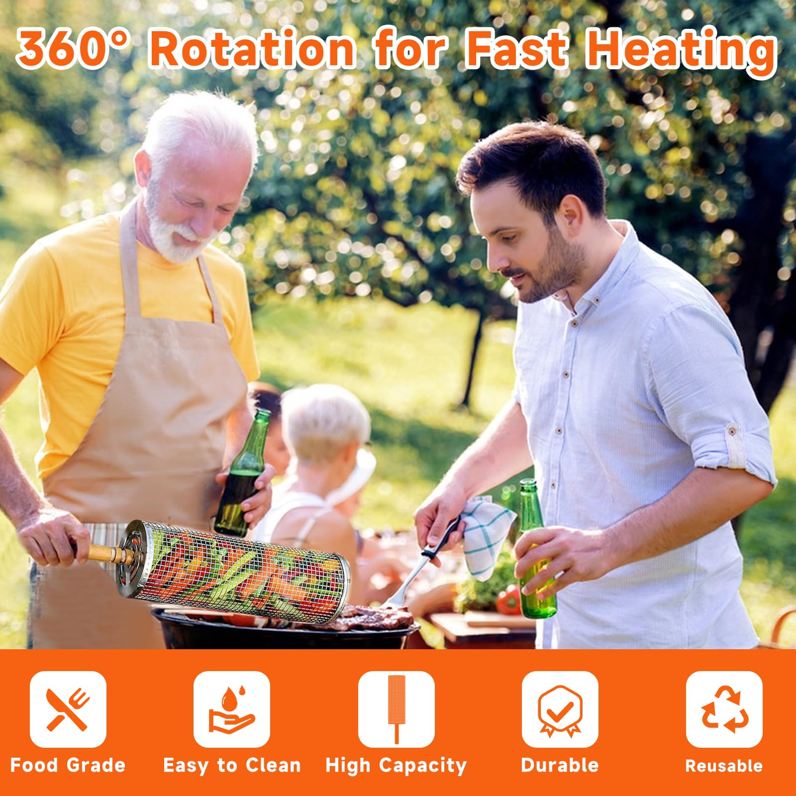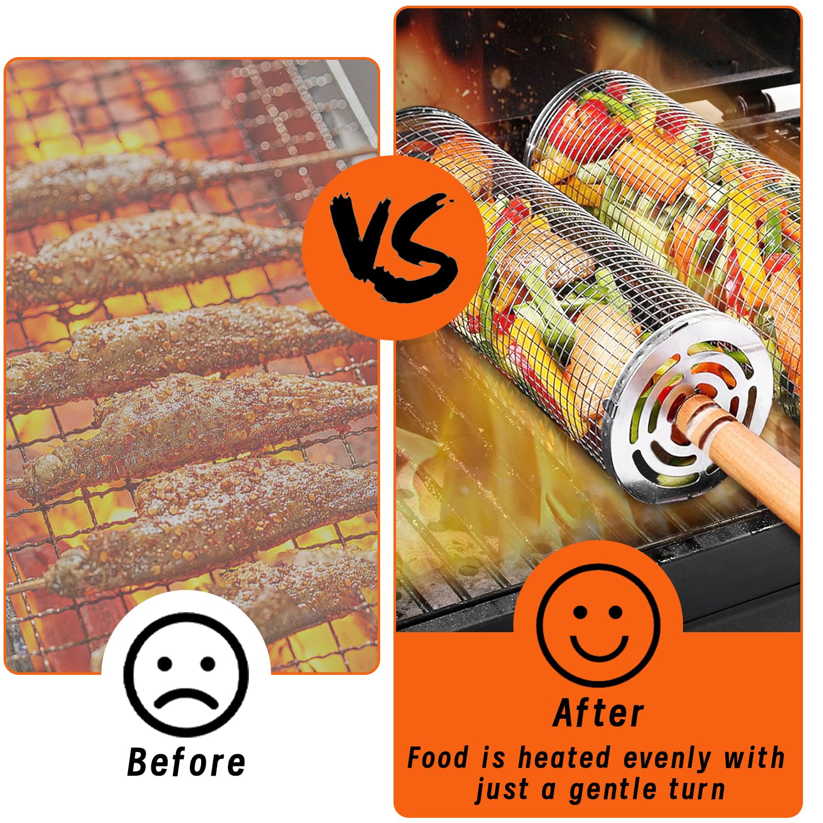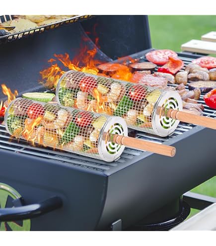 Grillen war noch nie so einfach! Mit diesen rollenden Grillkörben aus 304 Edelstahl wird jedes Grillgut zum Hit. Das Set hat zwei Größen - 31cm und 20cm - perfekt für verschiedene Lebensmittel. Ob Gemüse, Garnelen, Fisch oder Fleisch - in den Körben gart alles gleichmäßig und bleibt schön saftig. Das rollende Design ist genial: einfach Lebensmittel rein, Deckel zu und auf den Grill legen. Durch das Gitter bekommt alles die perfekte Grillnote ohne durchzufallen. Die Holzgriffe bleiben kühl und die Schnappverschlüsse halten sicher. Nach dem Grillen einfach in die Spülmaschine - praktischer geht's nicht! Super für Picknicks, Camping oder Gartenpartys. Du kannst sogar beide Körbe zusammen verwenden oder getrennt - total flexibel! Mit dem praktischen Haken zum Aufhängen sparst du Platz. Für alle Grillfans, die mehr wollen als nur Steaks - damit wird das Grillen zum Erlebnis!