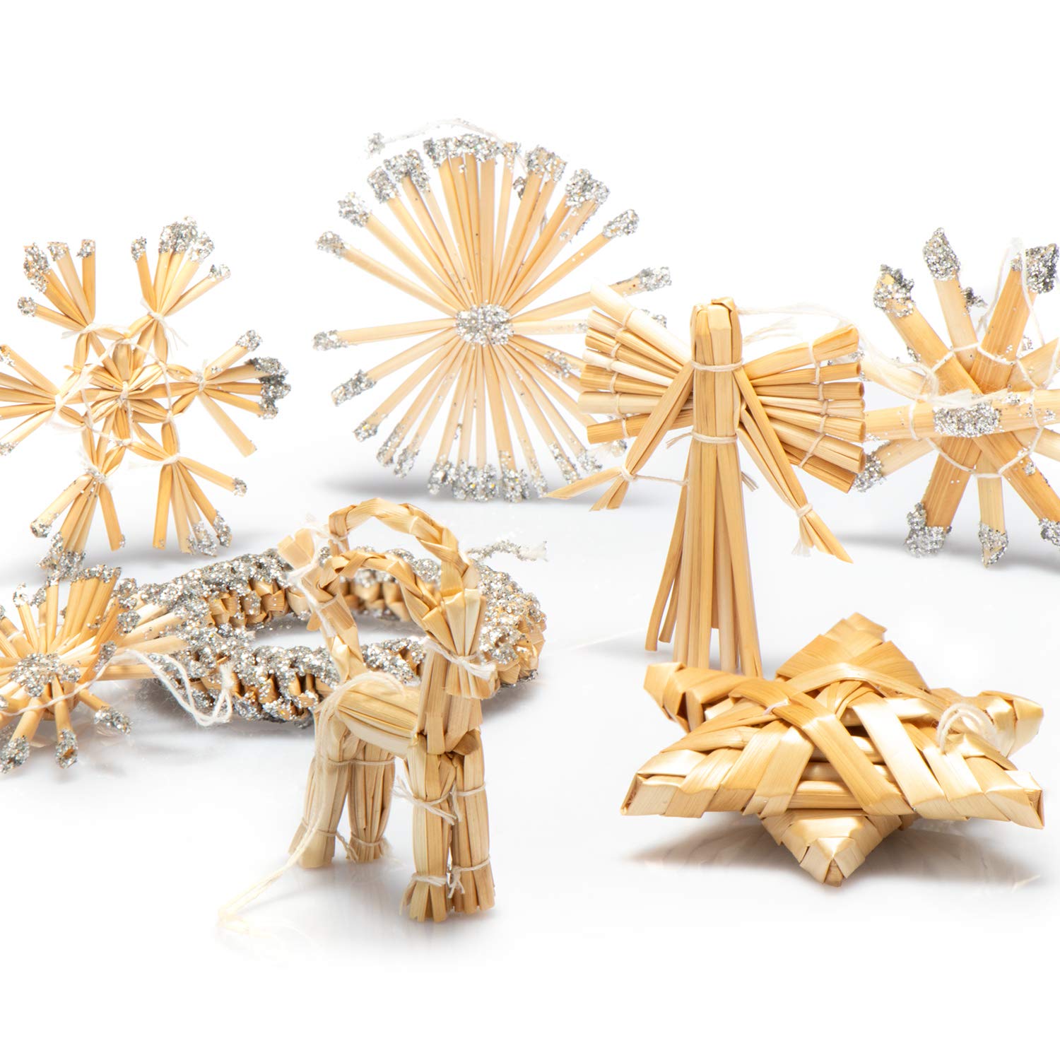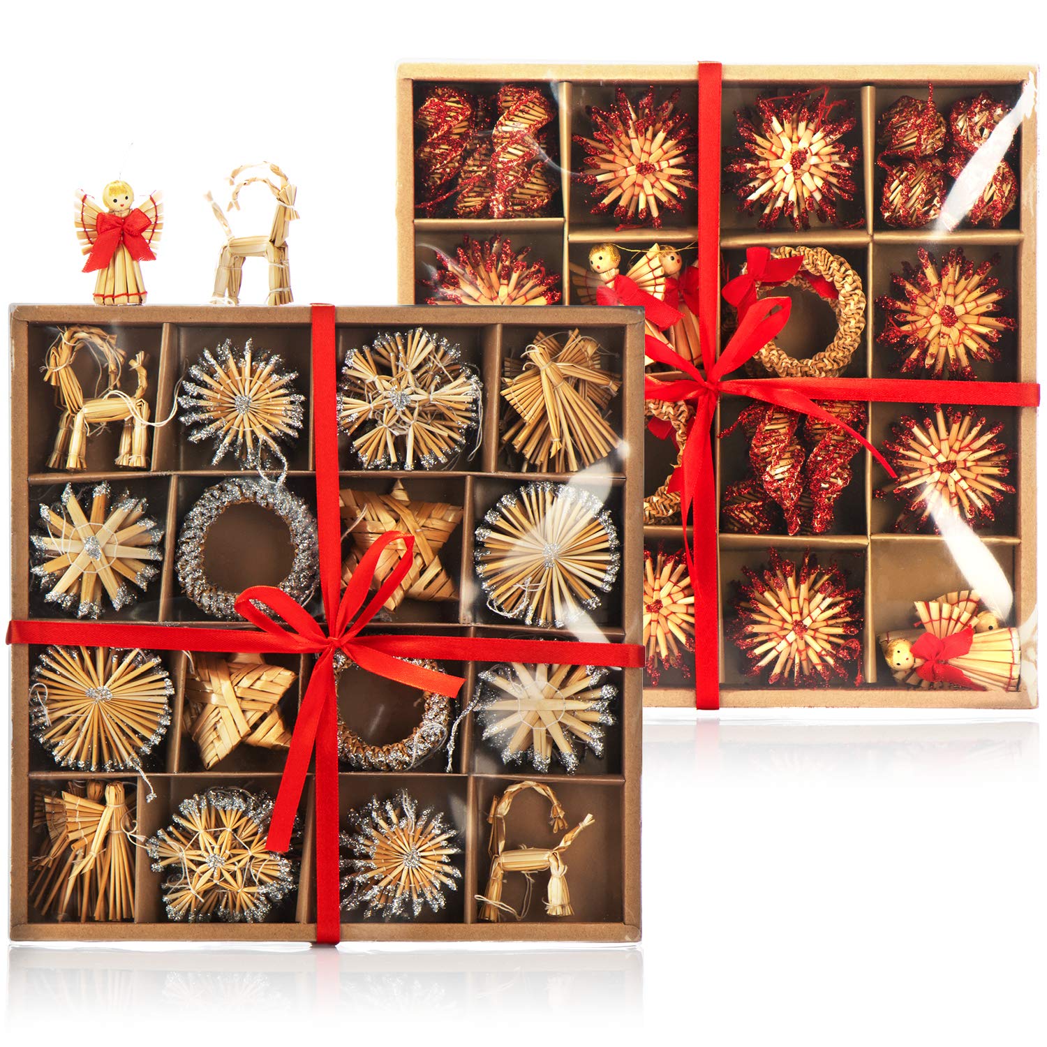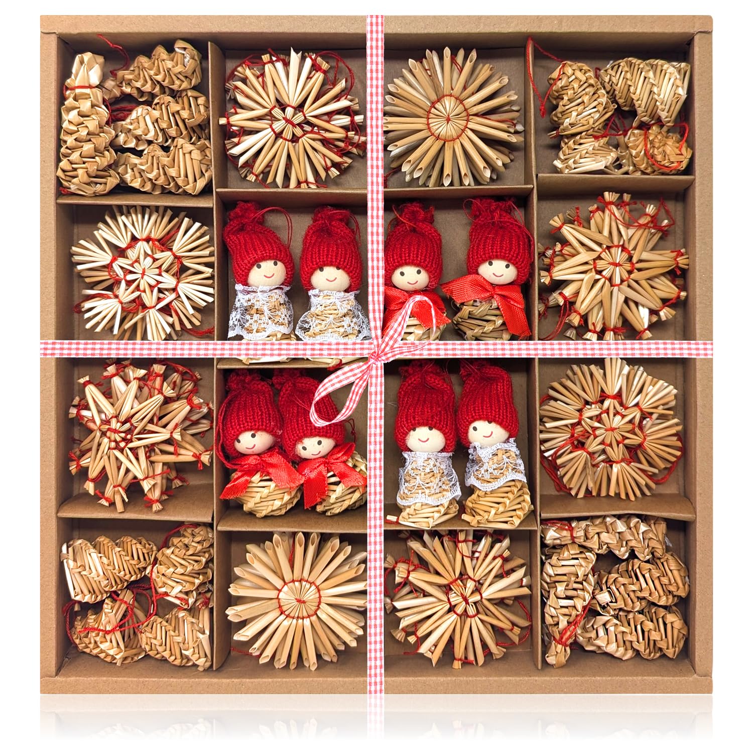 Com-four Strohsterne Set 112-teilig - Traditioneller Christbaumschmuck Mit Engeln, Tannen & Glocken