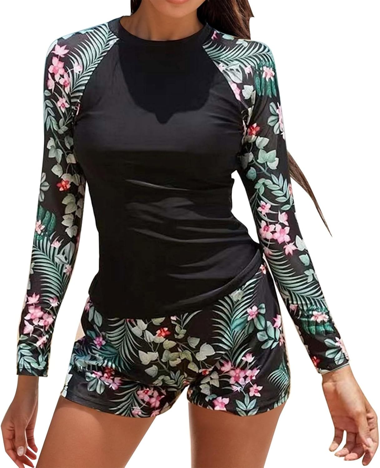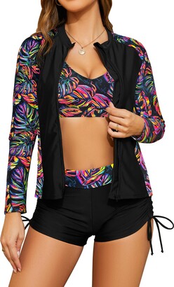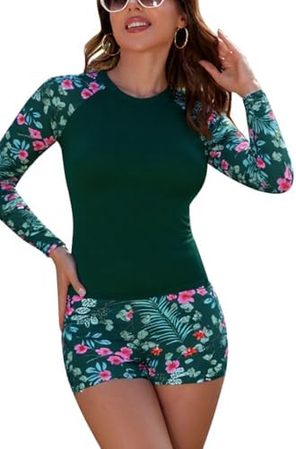 SHEKINI 2-teiliger Badeanzug Mit UV Schutz & Integriertem BH - Langarm Rashguard + Boyshorts Im Tropical Print