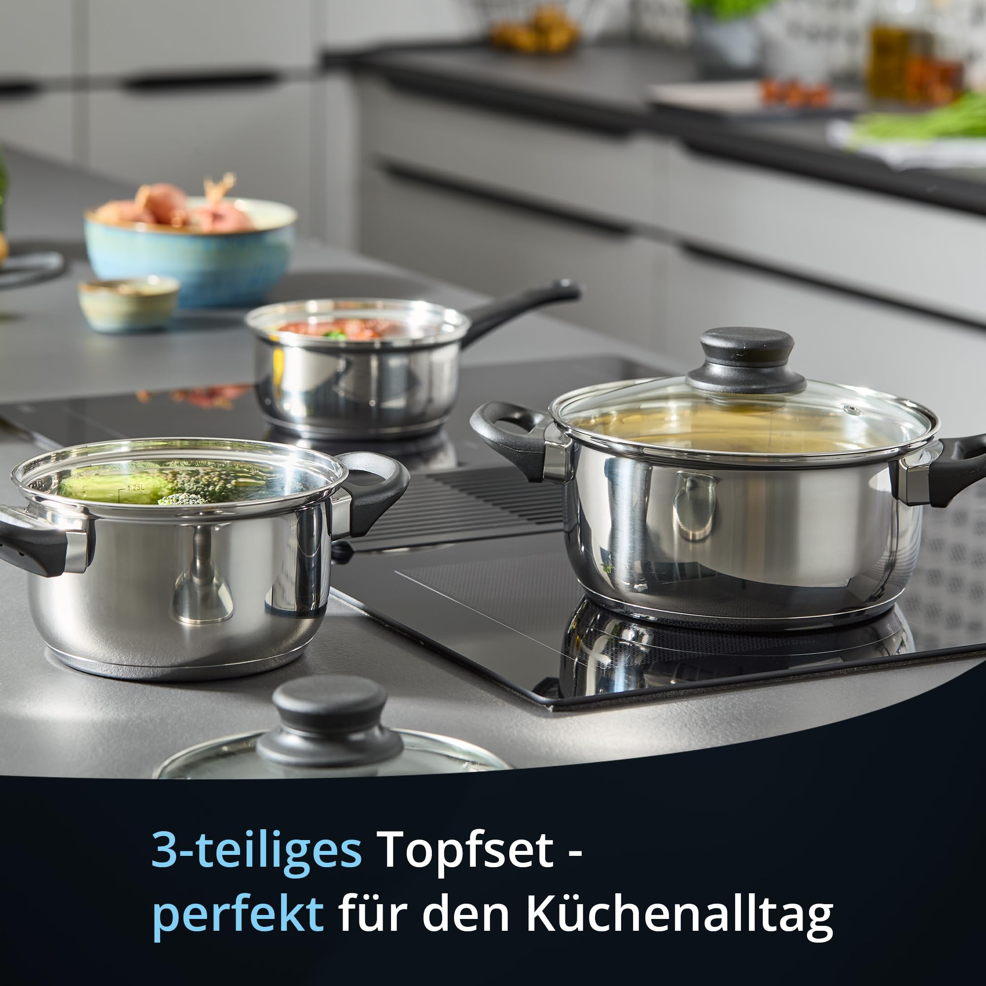 Dieses KHG Topfset ist einfach perfekt für jede Küche! Im Set enthalten: 14cm Kasserolle, 16cm Kochtopf und 20cm Kochtopf - alle mit praktischen Glasdeckeln. Aus hochwertigem Edelstahl für gleichmäßige Wärmeverteilung. Die großen Kunststoffgriffe mit Edelstahl-Flammschutz liegen super in der Hand und bleiben kühl. Passt auf ALLE Herdarten: Induktion, Gas, Elektro und Ceran. Mit Innenskala zum einfachen Abmessen. Spülmaschinengeeignet - easy zu reinigen. Einfach ein tolles Set für Einsteiger und Profi-Köche! Damit macht Kochen richtig Spaß und deine Küche sieht dabei noch stylisch aus.