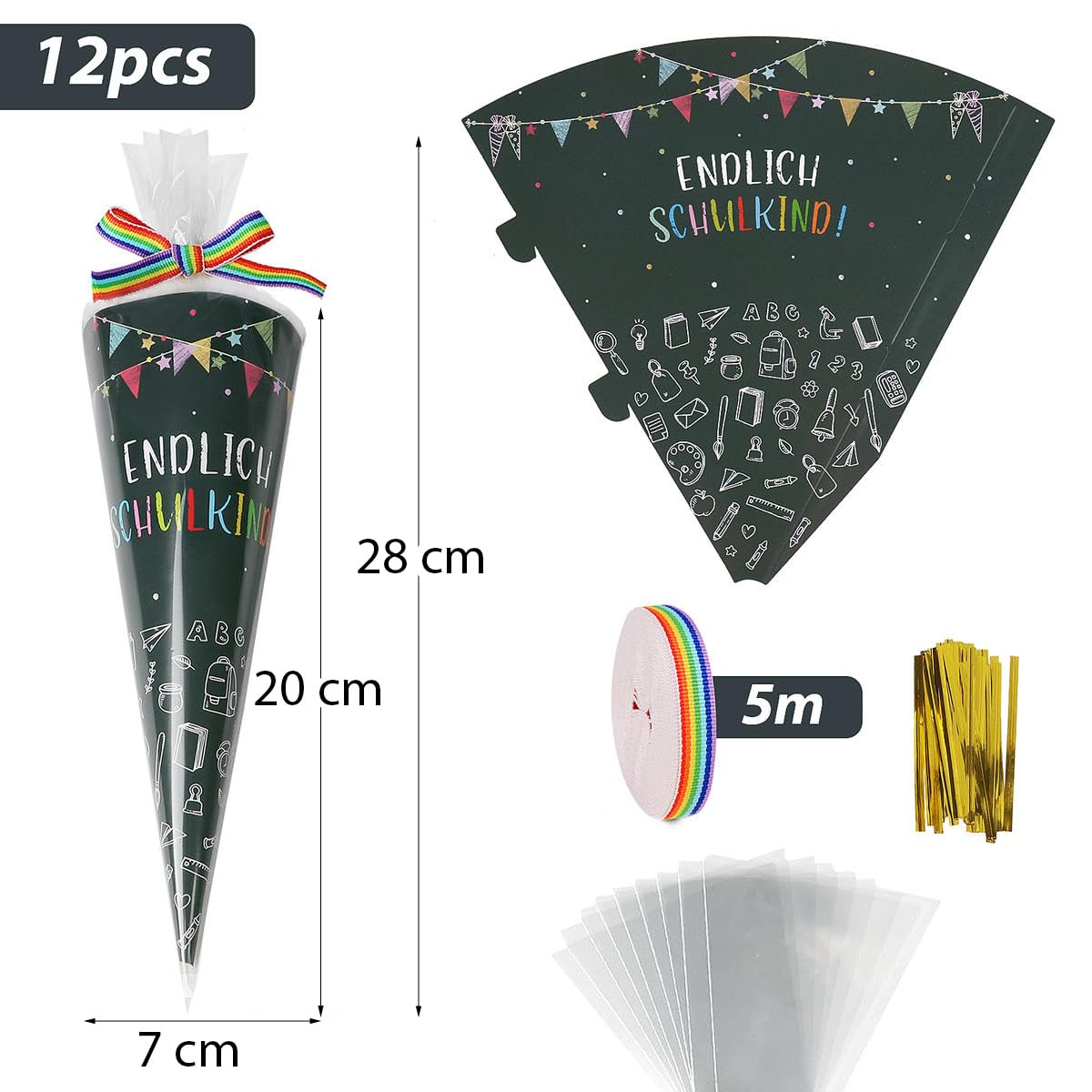 Zur Einschulung nicht nur das Schulkind beschenken! Dieses süße Set mit 4 kleinen Schultüten ist perfekt für Geschwister, die sonst leer ausgehen würden. Jede Tüte ist schon gefüllt mit liebevollen Kleinigkeiten: Buntstifte, Armbänder, Regenbogen-Schlüsselanhänger, Radiergummi und eine 'Hurra endlich Schulkind'-Karte. Die Tüten sind etwa 30cm groß - also nicht zu groß, aber groß genug für eine schöne Überraschung. Super auch als Geschenk für Erzieherinnen zum Kindergartenabschluss. Alles sofort einsatzbereit, du musst nichts mehr befüllen. Mach die Einschulung zu einem besonderen Tag für die ganze Familie!