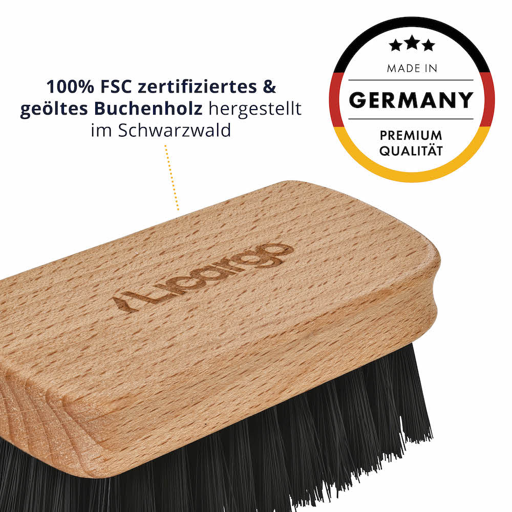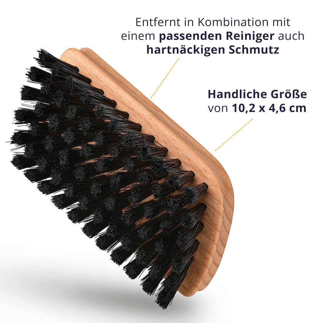 Damit dein Wildleder wie neu aussieht! Diese Lederbürste mit ergonomischem Holzgriff aus Buche liegt super in der Hand. Perfekt zum Entfernen von Flecken von Wildleder, Nubuk oder matten Lederoberflächen. Einfach mit einem Ölreiniger vorbehandeln, dann mit der Bürste und einem Reinigungskleber abwischen. Abschließend mit Pflege- und Imprägnierspray behandeln - schon ist dein Leder geschützt. Kompakt, leicht (nur 90 g) und ideal für unterwegs. So bleibt jedes Teil lange schön!