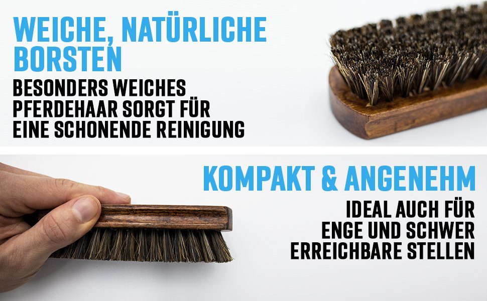 Damit dein Wildleder wie neu aussieht! Diese Lederbürste mit ergonomischem Holzgriff aus Buche liegt super in der Hand. Perfekt zum Entfernen von Flecken von Wildleder, Nubuk oder matten Lederoberflächen. Einfach mit einem Ölreiniger vorbehandeln, dann mit der Bürste und einem Reinigungskleber abwischen. Abschließend mit Pflege- und Imprägnierspray behandeln - schon ist dein Leder geschützt. Kompakt, leicht (nur 90 g) und ideal für unterwegs. So bleibt jedes Teil lange schön!