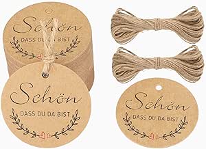 Mach deine Geschenke persönlich! Diese 100 Geschenkanhänger von BIROYAL mit der Aufschrift 'Schön dass du da bist' verleihen deinen Präsenten eine ganz besondere Note. Jeder Anhänger hat einen Durchmesser von 5 cm und ist aus stabilem, hochwertigem Papier gefertigt. Die mitgelieferte 50 cm lange Juteschnur in Naturoptik macht das Befestigen zum Kinderspiel. Vier verschiedene Designs sorgen für Abwechslung - je 25 Stück von jedem Muster. Die Rückseite ist unbeschriftet, sodass du noch persönliche Worte hinzufügen kannst. Perfekt für Hochzeitsgeschenke, Geburtstage, Weihnachten oder selbstgemachte Aufmerksamkeiten! Die Anhänger eignen sich auch super als Etiketten, Preisschilder oder Lesezeichen. Mit ihrem natürlichen, vintage-artigen Look kommen sie bei Liebhabern von Handgemachtem besonders gut an. Ein Must-have für alle, die ihre Geschenke mit Liebe verpacken möchten!