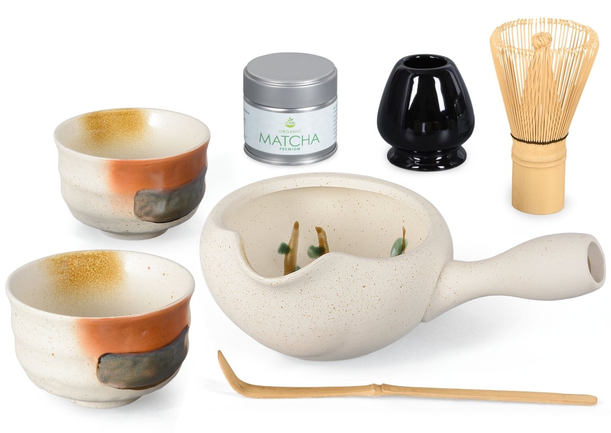 Wow, dieses Matcha-Set ist perfekt für alle, die den grünen Tee am liebsten zu zweit genießen! Enthalten ist eine schöne Anschlagschale mit 450ml Fassungsvermögen für die Zubereitung und zwei edle Trinkschalen à 250ml. Das Design in beige-braun ist einfach nur elegant und bringt japanisches Flair in dein Zuhause. Mit dabei sind auch ein handgefertigter Bambus-Besen (Chasen) mit 100 Borsten für perfekten Schaum und ein Bambuslöffel (Chashaku) zur genauen Portionierung. So wird Matcha-Trinken zum echten Gemeinschaftserlebnis! Die Schalen sind ergonomisch durchdacht und liegen super in der Hand. Ob für gemütliche Abende zu zweit oder um Gäste zu beeindrucken - dieses Set macht einfach Spaß! Einfach Matcha-Pulver einwiegen, mit heißem Wasser aufgießen, mit dem Besen kräftig schlagen und dann in die beiden Trinkschalen verteilen. So einfach kann traditioneller Matcha-Genuss sein!