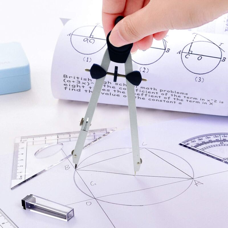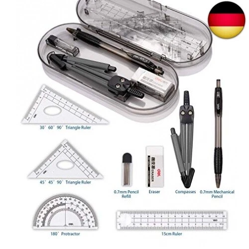 Alles drin, was du für Mathe und Technisches Zeichnen brauchst! Dieses 10-teilige Geometrie-Set enthält 2 Metallzirkel, 2 Geodreiecke (45° und 30°/60°), ein 15cm Lineal, einen 10cm Winkelmesser, Bleistift, Spitzer, Radiergummi und Ersatzminen. Alles sicher verpackt in einer stabilen Aufbewahrungsbox, die auch Transporte problemlos übersteht. Die Kunststoffteile sind robust und brechen nicht so leicht - made to last! Perfekt für Schüler, Studenten, Architekten, Künstler und Ingenieure. Das klare Lineal mit präzisen Skalen garantiert genaue Messungen. Ein super Geschenk für jeden, der präzise arbeiten muss - ob im Unterricht, im Büro oder zu Hause am Zeichentisch!