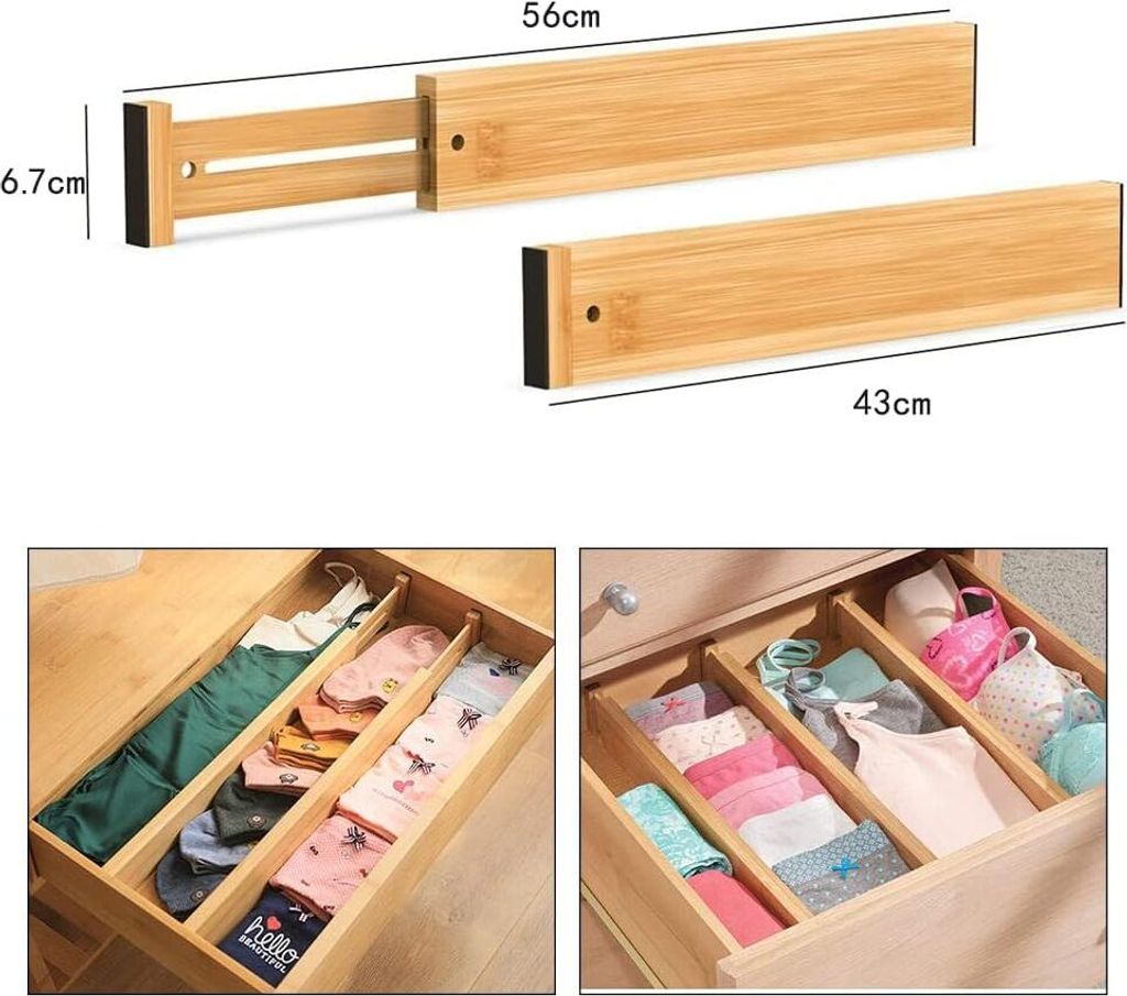 Schluss mit chaotischen Schubladen! Dieses 10-teilige Set aus Bambus bringt Ordnung in deine Küche, Schreibtisch oder Kommode. Die Trenner sind von 34-44 cm verstellbar und passen sich mit Sprungfedern perfekt an deine Schublade an. Die Gummierung an den Seiten verhindert Rutschen. Einfach die 6 verstellbaren Halter und 4 Verbindungsteile nach Bedarf anordnen - für Besteck, Bürobedarf, Kosmetik oder Werkzeug. Aus natürlichem Bambus, nachhaltig und langlebig. Endlich alles griffbereit und übersichtlich!