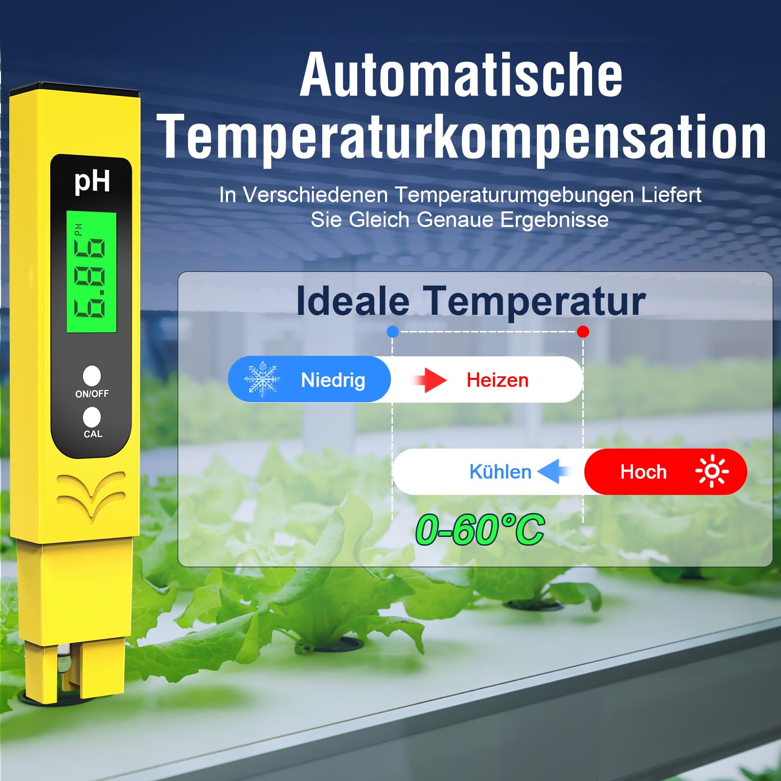 Professionelles pH-Messgerät für alle die es genau wissen wollen! Mit Labor-Genauigkeit von ±0,01 pH - da geht nichts daneben. Perfekt für Pool-Besitzer, Aquarien-Freunde oder wenn du dein Trinkwasser checken willst. Das coole blaue LCD-Display siehst du auch bei Sonne super - kein Blenden! Automatische Temperatur-Kompensation - das Gerät rechnet die Werte selbst richtig um. Macht innerhalb von 30 Sekunden fertig - super schnell! Aus robustem ABS-Kunststoff - hält auch aggressive Lösungen aus. Mit Schutzkappe für den Sensor - bleibt immer empfindlich. Einfache Bedienung - nur einschalten und messen. Inklusive 3 Kalibrier-Pulver für perfekte Genauigkeit. Echt praktisch für Haushalt, Garten oder Hobby - damit weißt du immer was im Wasser los ist!
