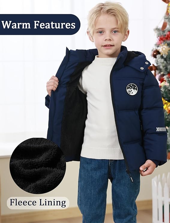 Kinder Winterjacke Jungen - Gefütterter Wintermantel Winddicht, Mit Kapuze & Fleece-Innenfutter