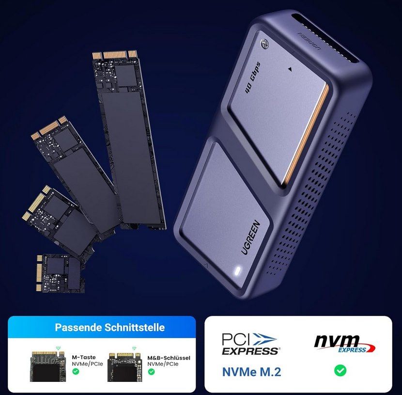 Tech-Fans, dieses UGREEN SSD-Gehäuse ist der absolute Hammer! Bis zu 40Gbps Geschwindigkeit - das sind satte 3600MB/s! Perfekt für 4K Video-Bearbeitung, große Spiele oder Datei-Transfers. Kompatibel mit Thunderbolt 4, USB4 - passt zu MacBook Pro 2024 M4, Mac mini M4, ASUS Z890 und mehr! Vollständig passive Kühlung - doppelseitige Metallkühlrippen + Wärmeleit-Silikon. Lüfterlos - absolut geräuschfrei! Intelligenter USB4-zertifizierter Chip - unterstützt SMART, TRIM für Stabilität. Einfach deine M.2 NVMe SSD einsetzen und loslegen! Steht vertikal mit Anti-Rutsch-Pads - bessere Luftzirkulation. Ob für Mac, PC, iPad, PS5 - dieses Gehäuse macht aus deiner SSD eine super schnelle externe Festplatte! Hol dir diesen Geschwindigkeits-Boost!