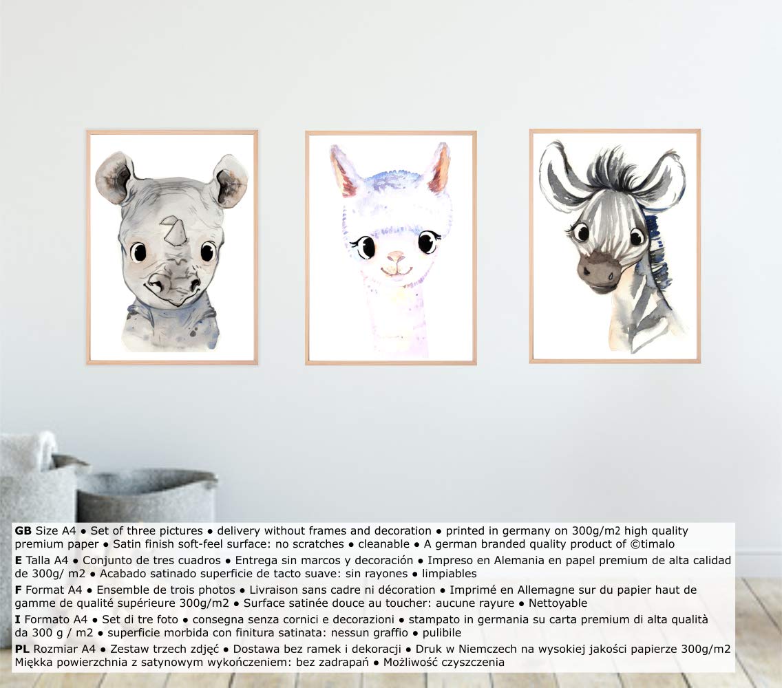 Oh, wie süß! Diese 3 Babyzimmer-Bilder mit den Tier-Motiven lassen nicht nur Kinderaugen strahlen. Da hast du einen fröhlichen pinken Flamingo, eine grüne Schildkröte und einen gelben Fisch - alles in traumhaften Aquarellfarben gemalt. Hergestellt in Deutschland auf richtig hochwertigem 300g Fotokarton mit dieser speziellen Soft-Feel Beschichtung. Die fühlt sich nicht nur super weich an, sondern ist auch noch kratzfest und feucht abwischbar! Perfekt also für Kinderzimmer, wo mal was daneben gehen kann. Jedes Bild ist im Hochformat A4 (21x29,7 cm) und kommt ohne Rahmen - da kannst du dir selbst aussuchen, welcher Rahmen am besten zu deinem Zimmer passt. Ob fürs Mädchenzimmer, Jungenzimmer oder Babyzimmer - diese Bilder passen einfach überall hin! Super als Geschenk zur Babyparty, zur Geburt oder einfach so. Die internationalen Künstler haben hier richtig tolle Arbeit geleistet. Die Bilder sind nicht zu verspielt, sondern modern und zeitlos schön. Dein Kind wird die Motive lieben - und du auch!