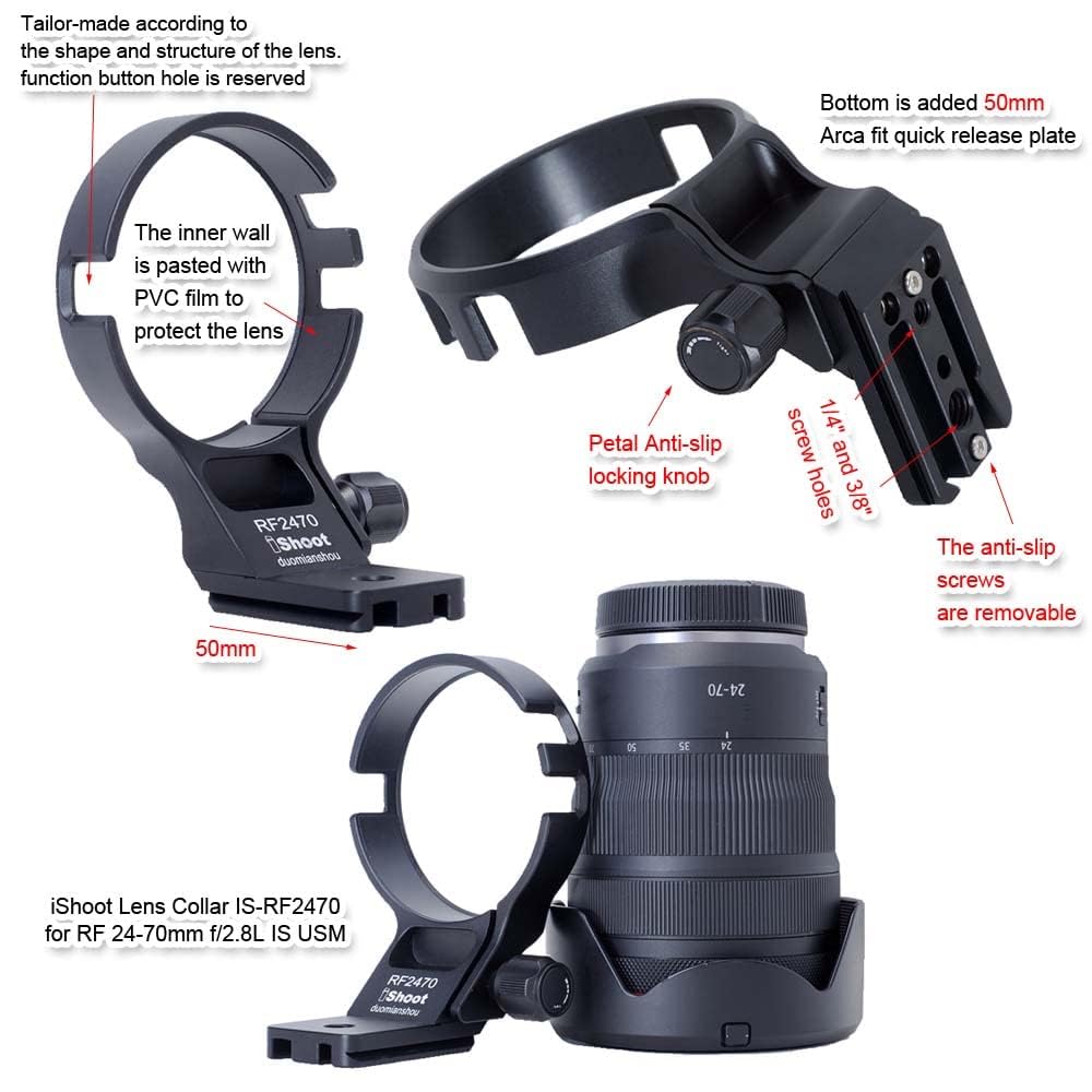 Professionelle Lösung für dein Canon RF 28-70mm f/2L Objektiv! Dieser iShoot Stativring aus hochdichtem Aluminium ist speziell für dieses Objektiv maßgeschneidert. Mit 74,5mm Innendurchmesser und 18mm Breite sitzt er perfekt und unterstützt vertikale Aufnahmen. Die Unterseite hat eine 70mm lange Arca-Swiss Schnellwechselplatte - kompatibel mit allen gängigen Stativköpfen im 39mm Standard. Das CNC-gefärste Design ist präzise verarbeitet, ausgehöhlt für geringeres Gewicht (nur 185g) und poliert für ein premium Finish. Der Verriegelungsknopf hat ein rutschfestes Design für sicheren Halt. Einfach montieren und von besserer Balance und Stabilität profitieren - besonders wichtig bei schweren Objektiven wie dem RF 28-70mm f/2L. Die mitgelieferte 3M-Schutzfolie schützt dein Objektiv vor Kratzern. Ein Muss für jeden Canon-Fotografen, der das Maximum aus seinem Equipment herausholen will!