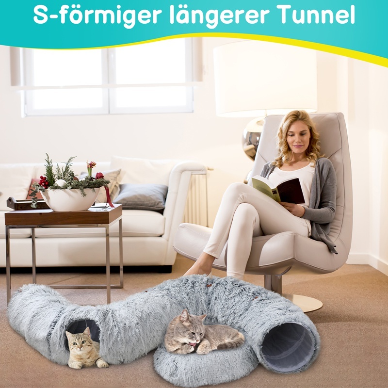 Deine Katze wird diesen Tunnel lieben! Mit 25cm Durchmesser und 100cm Länge bietet er genug Platz zum Verstecken und Spielen. Die integrierte Raschel-Schicht macht verlockende Geräusche die jede Katze anziehen. Am Ende baumelt ein süßer Ball zum Jagen. Aus weichem Plüsch innen mit Polyestervlies - super gemütlich zum Schlafen. Wenn nicht in Gebrauch, einfach zusammendrücken und mit den Bändern fixieren - platzsparend verstaut. Perfekt für eine oder mehrere Katzen - sorgt für stundenlangen Spielspaß!