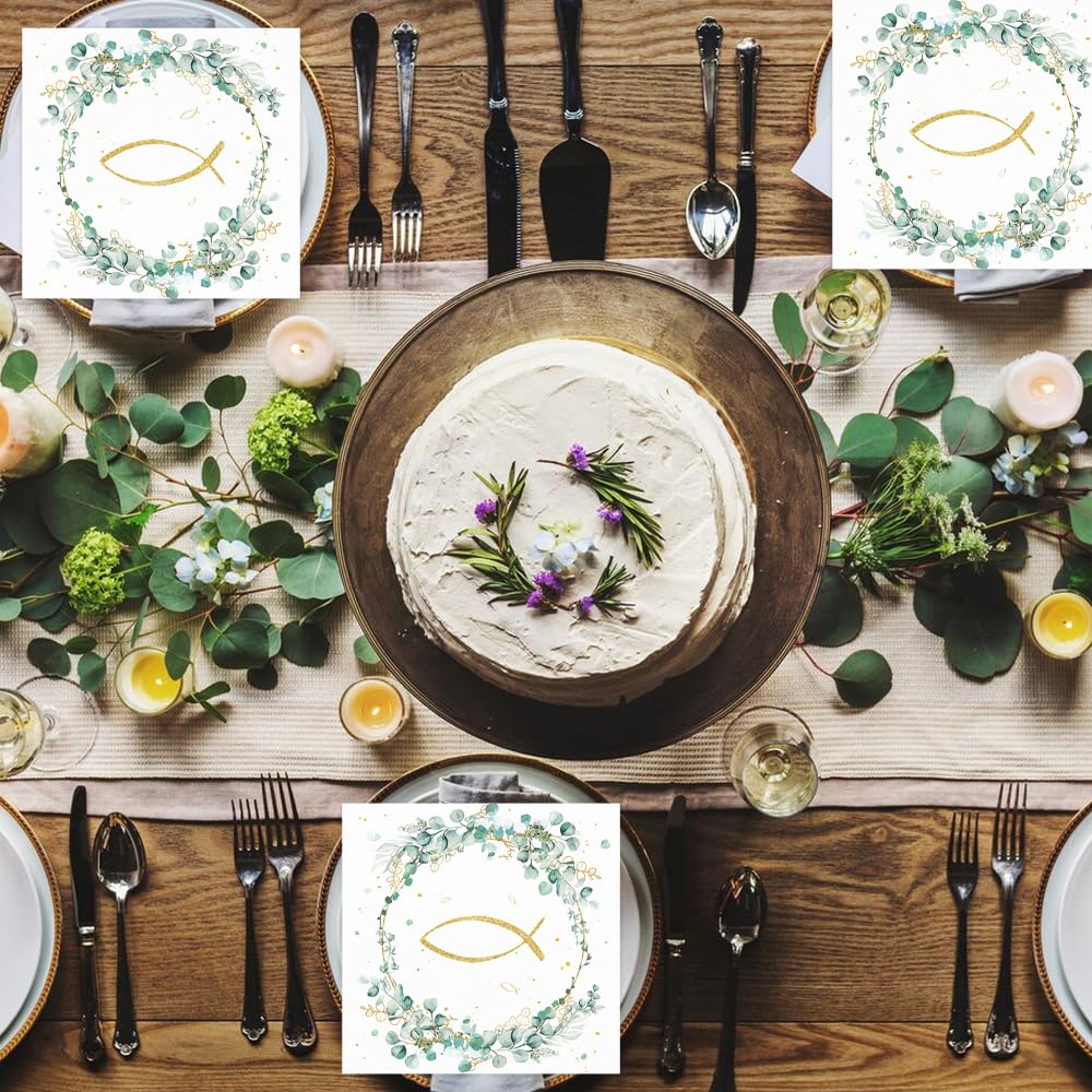 40 Stück Servietten Mit Fisch & Eukalyptus Design - Weiße Festtags-Servietten